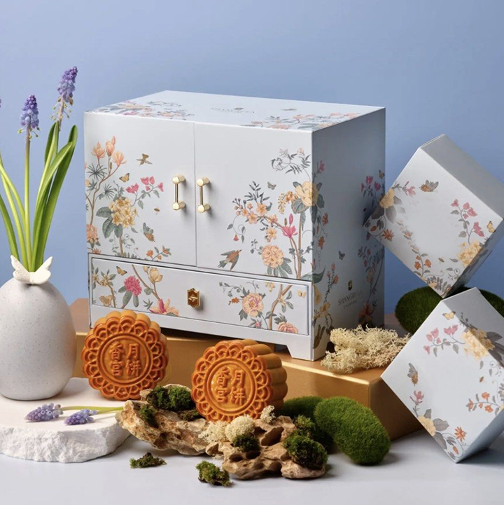 Điểm nhấn nằm ở phụ liệu quai kim loại sáng bóng, vừa tiện lợi khi mang xách, vừa tạo cảm giác cao cấp ngay từ cái nhìn đầu tiên. Họa tiết và tông màu lấy cảm hứng từ không gian Shangri-La, hòa quyện nét hiện đại và nghệ thuật Á Đông, phù hợp cho quà tặng doanh nghiệp, khách VIP, sự kiện lễ hội Trung Thu hoặc trưng bày không gian sang trọng.