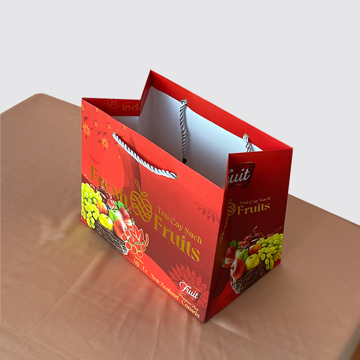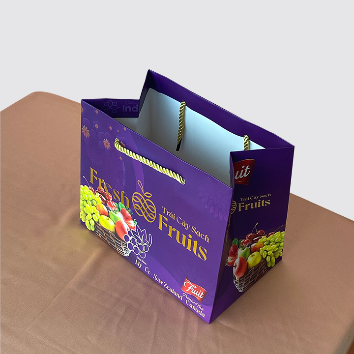 Túi giấy ép kim sang trọng của Inday Creative – giải pháp đóng gói hoàn hảo cho trái cây nhập khẩu, quà tặng thực phẩm cao cấp.