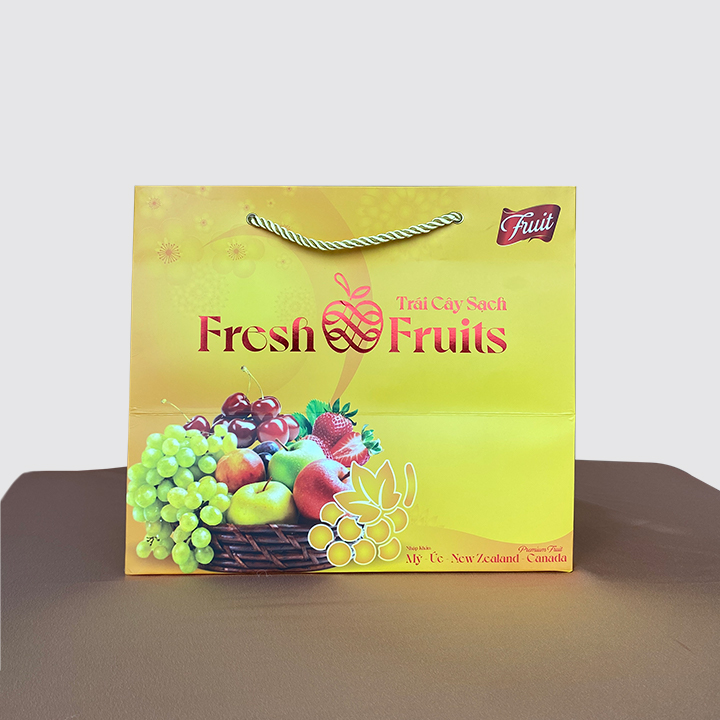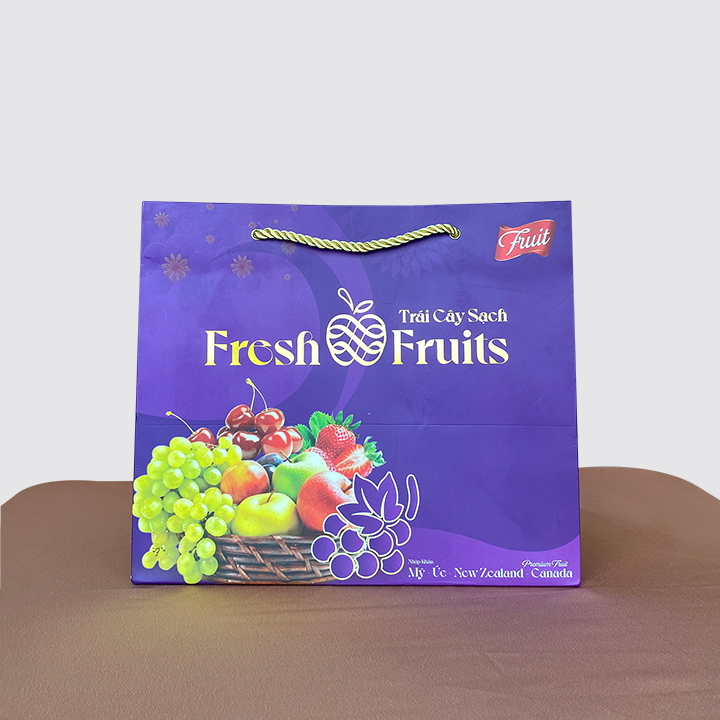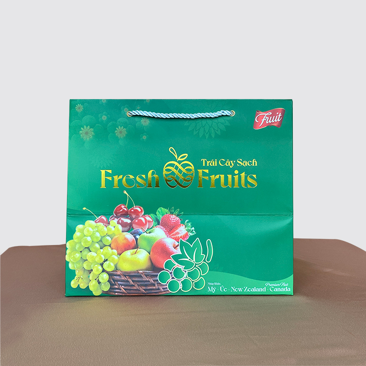Túi giấy ép kim sang trọng – Nâng tầm trải nghiệm quà tặng và khẳng định thương hiệu trái cây nhập khẩu.